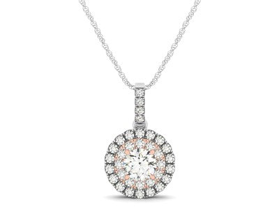 A stunning round diamond center is surrounded by a sparkling halo of diamonds, set in a luxurious blend of 14k white and rose gold. This pendant is perfect for those who love the balance of timeless beauty and modern sophistication. Its unique color contrast makes it a standout piece for both casual and formal occasions.
