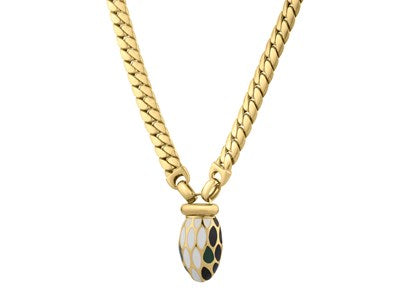 This 14K Yellow Gold Le Serpent Curb Link Necklace features a distinctive and bold design with interlocking curb links that flow smoothly, reminiscent of the sinuous movement of a serpent. Crafted from high-quality 14K yellow gold, enhanced with accents of black and green enamel. this necklace offers a luxurious and sophisticated look. The unique Le Serpent design adds a modern edge, making it perfect for both everyday wear and special occasions. This statement piece is a timeless addition to any jewelry collection, combining elegance with a touch of fierceness.
