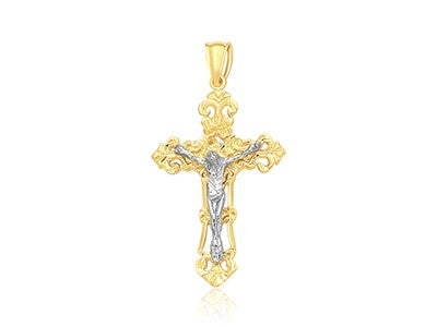 This Two-Tone Cross Pendant, crafted in 14k Gold, beautifully combines the warmth of yellow gold with the sleekness of white gold, creating a striking contrast. The elegant design symbolizes both faith and style, making it a timeless piece perfect for any occasion. With its sophisticated two tone finish, this pendant adds a refined touch of luxury to any jewelry collection